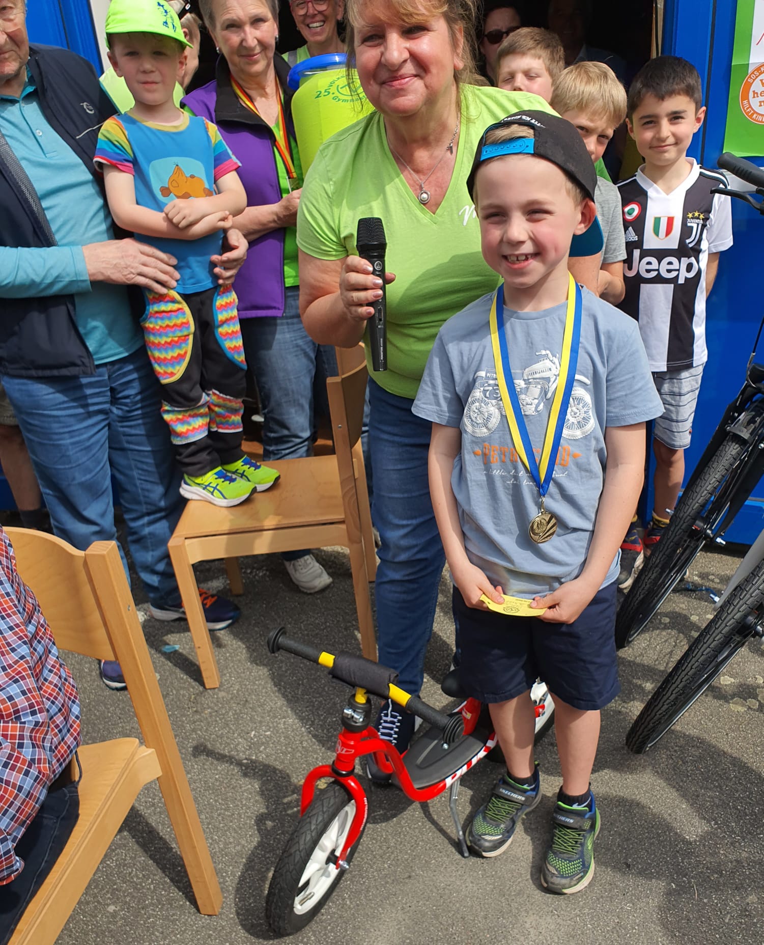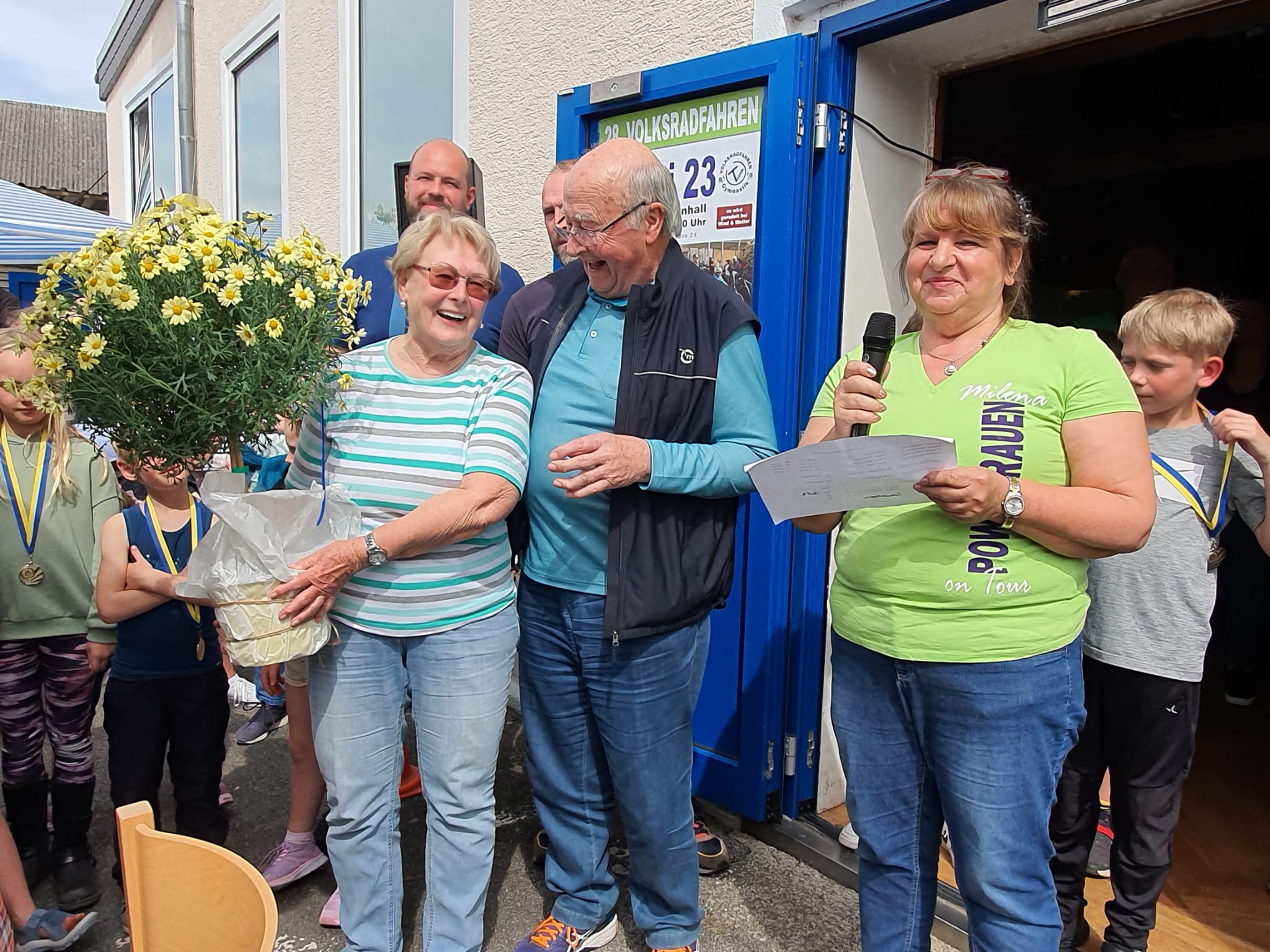 Am Ziel – der Tornhall – wieder angekommen, lockte das Angebot an Speisen, Getränken und Kuchen. Kurt Sauerborn begrüßte im Auftrag des Bürgermeisters die Gäste und bedankte sich bei allen freiwilligen Helfern für die tolle Organisation und die gelungene Veranstaltung. Danach stand die Ehrung verschiedener Teilnehmer bzw. -gruppen auf dem Plan: Die jüngsten Fahrradfahrer waren Zelda und Henry, beide 4 Jahre alt, sie erhielten jeweils einen Pokal für ihre tolle Leistung. Erika Sack war die älteste Teilnehmerin mit 85 Jahren und bekam dafür ein Blumenpräsent. Adam Astheimer (86) erhielt als ältester aktiver Teilnehmer ein Weinpräsent des Weinguts Oswald. Die größte vereinsexterne Gruppe waren diesmal die Naturfreunde mit 19 Radfahrern und die größte vereinsinterne Gruppe waren die Handballer mit 78 Radlern. Sie erhielten ebenfalls ein Präsent zur Stärkung.