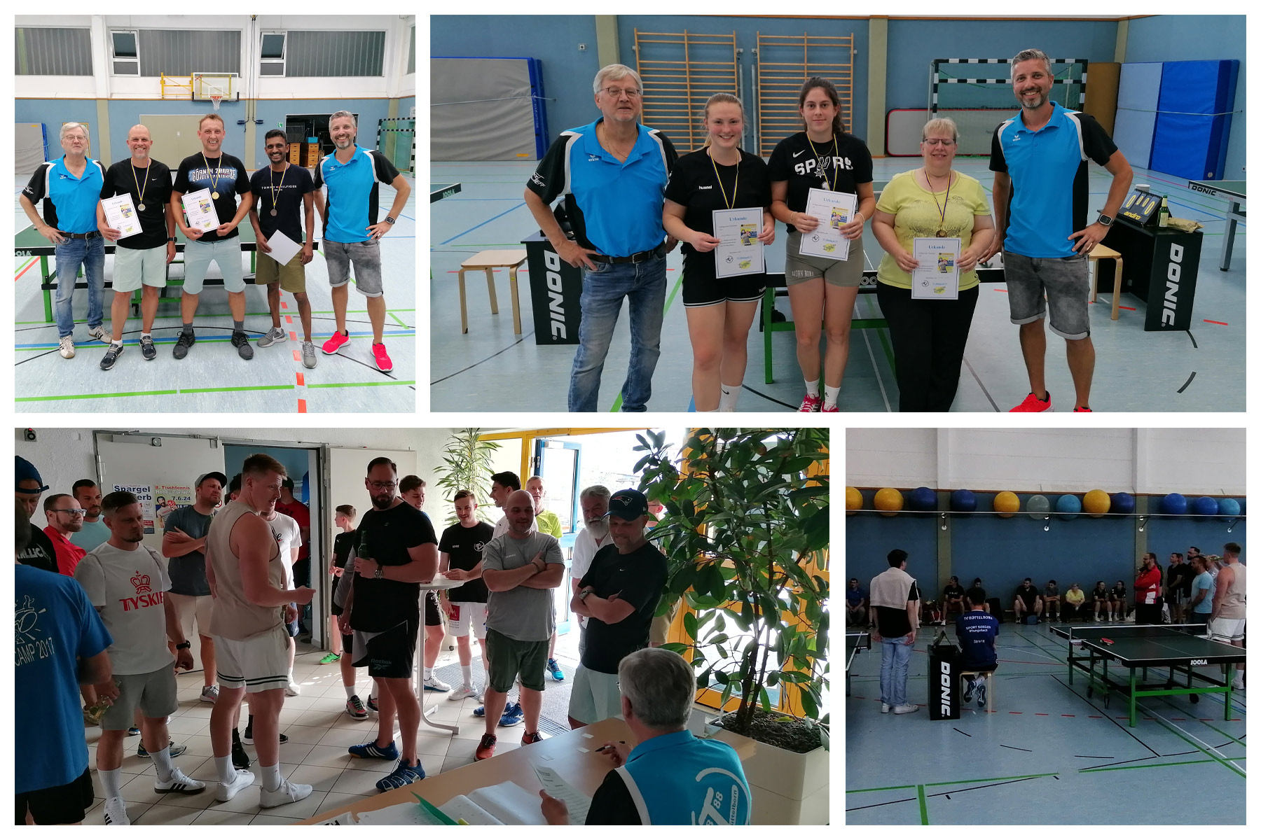 Gespielt wurde wie immer im Doppel-KO-System. Das heißt, wer einmal verliert ist noch nicht ausgeschieden und hat immer noch die Möglichkeit, das Turnier zu gewinnen. Wegen der sehr hohen Teilnehmeranzahl wurde anstatt der regulären 3 Gewinnsätze auf ein Spiel mit 2 Gewinnsätzen verkürzt. Was allen Teilnehmer bei den heißen Temperaturen in und um die Halle sehr entgegenkam. Nachdem die Turnierleitung unter dem Vorsitz von Wolfang Henn die Auslosung der Startplätze im Turnierplan festgelegt hatte, konnte es losgehen. Schnell ergaben sich spannende Spiele. An jeder Platte waren Spieler der TT-Abteilung als Schiedsrichter mit dabei.