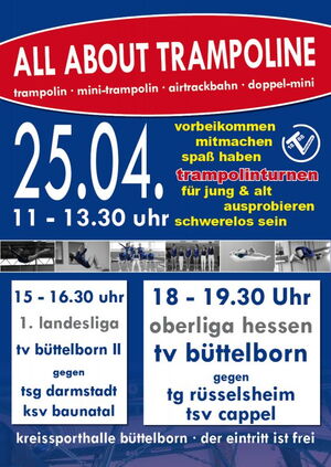 Du wolltest schon immer mal Trampolinspringen? Am Samstag, dem 25. April hast Du in der Zeit von 10.30 bis 13.30 Uhr Gelegenheit dazu. In der Büttelborner Kreissporthalle werden zwei Trampoline, ein Mini-Trampolin, ein Doppel-Mini und sogar eine Airtrack-Bahn für Dich bereitstehen. [Also, Sportklamotten anziehen, Freunde mitbringen um zu Springen kommen. Egal, ob Jung oder Alt – jeder darf kommen.