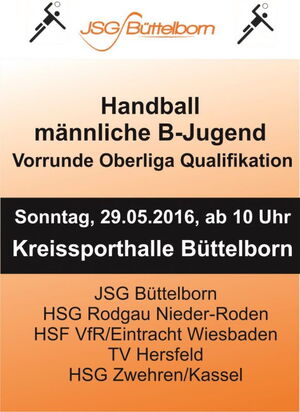 Für die nächste Runde hat sich die JSG Büttelborn wieder als Ausrichter beworben und auch den Zuspruch dafür erhalten. Wir freuen uns also auf ein sportliches Highlight beim Turnier am Sonntag, 29.05.16, ab 10.00 Uhr in der Kreissporthalle Büttelborn. Gegen die Mannschaften der HSG Rodgau Nieder-Roden, HSG VfR/Eintr. Wiesbaden, TV Hersfeld und HSG Zwehren/Kassel brauchen die Jungs lautstarke Untersützung. Für Essen und Trinken ist natürlich ebenfalls gesorgt.