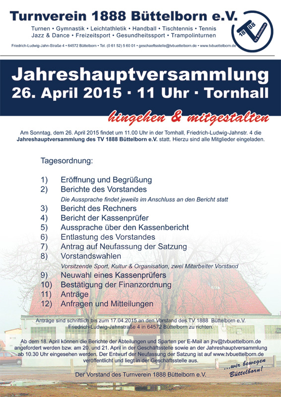Am Sonntag, dem 26. April 2015 um 11.00 Uhr findet in der Tornhall, Friedrich-Ludwig-Jahnstr. 4 die Jahreshauptversammlung des TV1888 Büttelborn e.V. statt. Hierzu sind alle Mitglieder herzlich eingeladen.